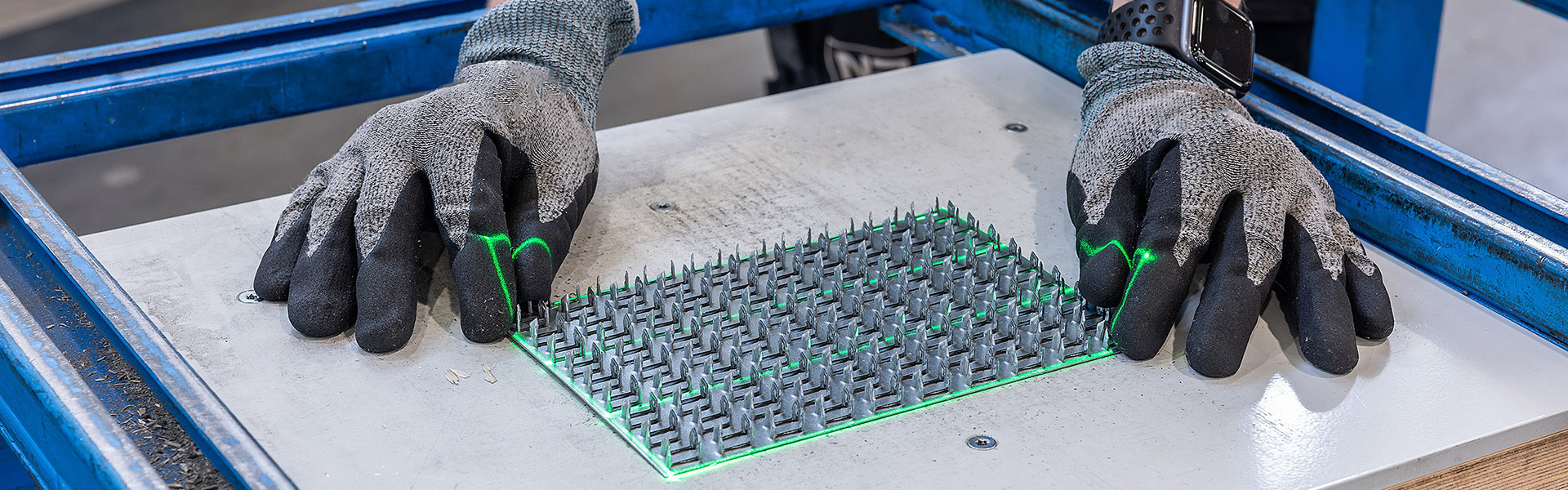 Les contours projetés vous montreront où placer les butées et les pinces, les membrures et les connecteurs métalliques sur vos tables de production. Si vous sélectionnez le CAD-PRO multicolore, le gabarit de montage, le bois et les plaques à clous peuvent être illuminés dans différentes couleurs: vert, rouge ou jaune. Pour les grandes tables, un nombre pratiquement illimité de projecteurs peut être assemblé. Les projecteurs laser LAP CAD-PRO sont capables de multitâche: vous pouvez travailler sur plusieurs gabarits du même lot ou de lots différents sur la même table indépendamment.